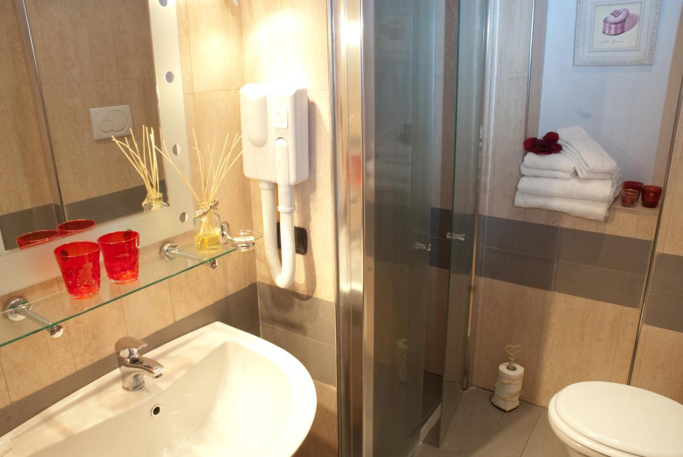 Camera Familiare con Doccia. Offering free toiletries, this family room includes a private bathroom with a walk-in shower, a bidet and a hairdryer. The family room offers a wardrobe, a sofa, a tiled floor, a flat-screen TV with cable channels, as well as mountain views. The unit offers 2 beds. ;