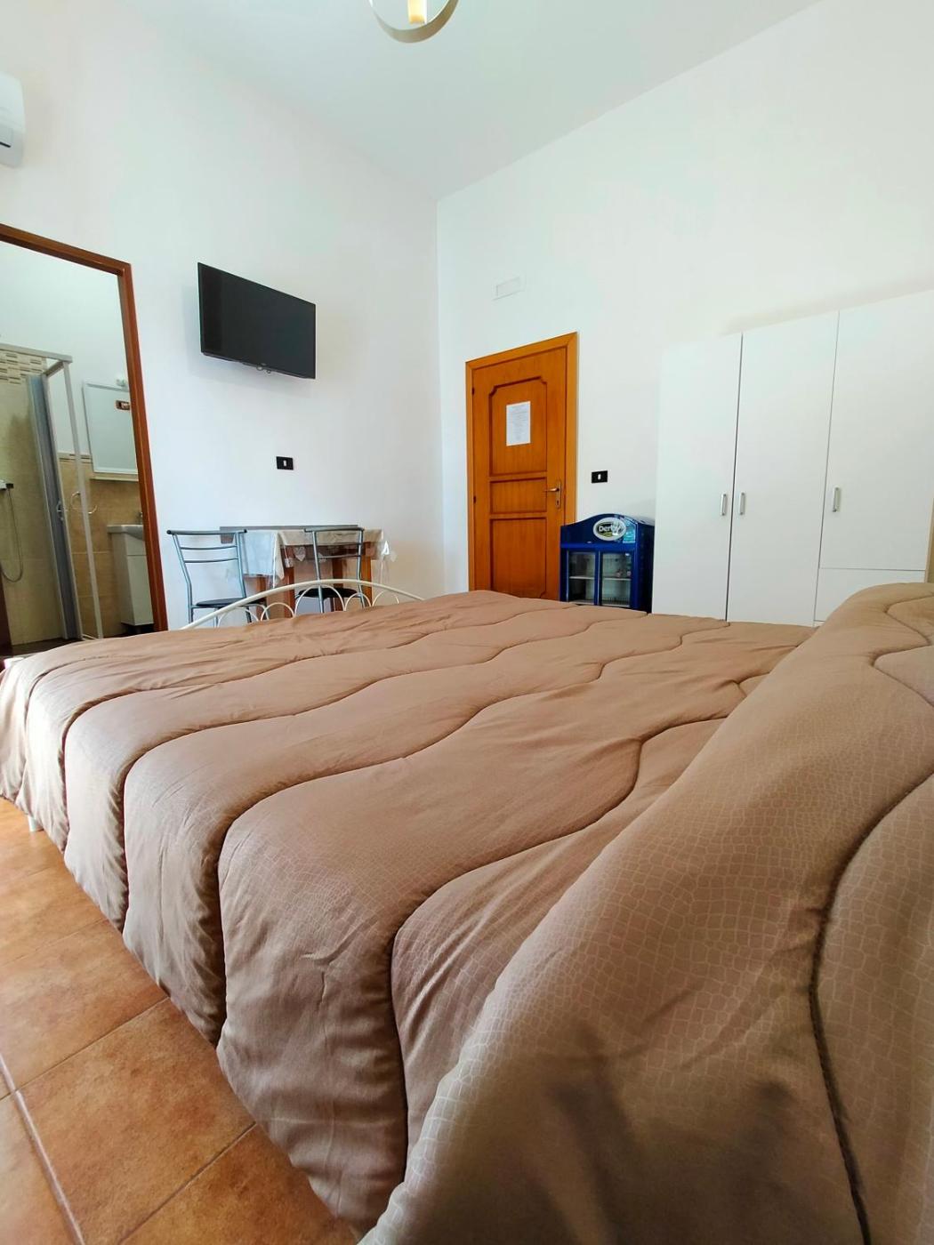 Camera Matrimoniale con Bagno Privato. Camera matrimoniale dotata di aria condizionata, minibar, balcone con vista sulla strada tranquilla e bagno privato con doccia a filo pavimento. L’alloggio presenta 1 letto. ;